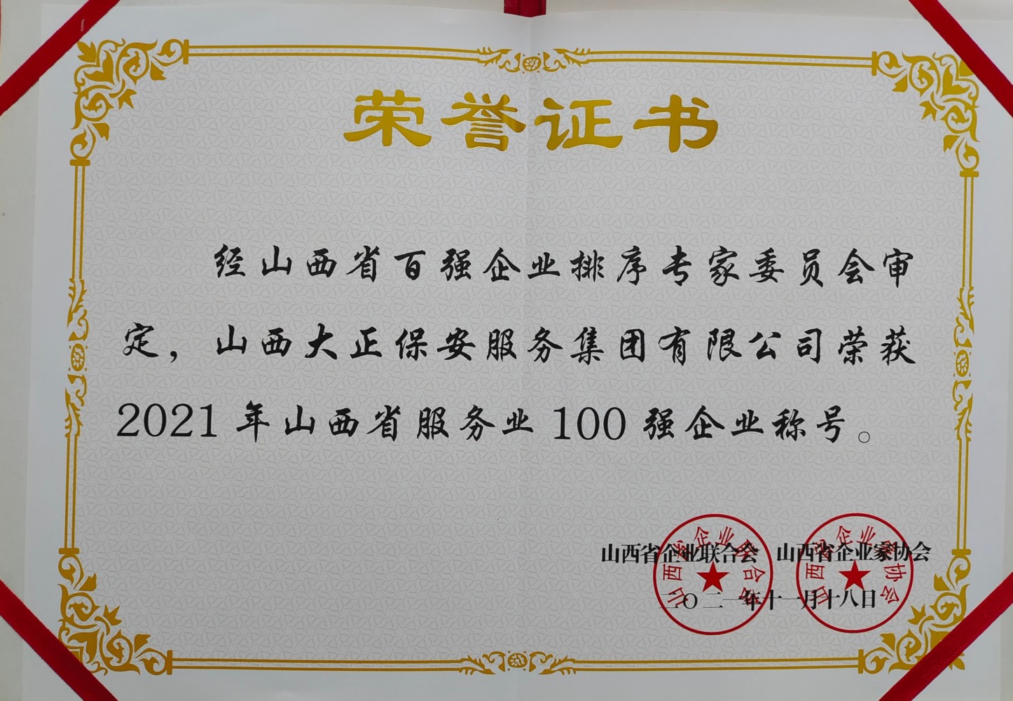 會(huì)議向社會(huì)發(fā)布“2021山西省企業(yè)100強(qiáng)”、“2021山西省制造業(yè)企業(yè)100強(qiáng)”、“2021山西省服務(wù)業(yè)企業(yè)100強(qiáng)”三項(xiàng)榜單。山西大正保安集團(tuán)連續(xù)第七年入榜“山西省服務(wù)業(yè)企業(yè)100強(qiáng)”,在今年榜單中名列第63位,實(shí)現(xiàn)社會(huì)知名度和品牌美譽(yù)度的進(jìn)一步提升。