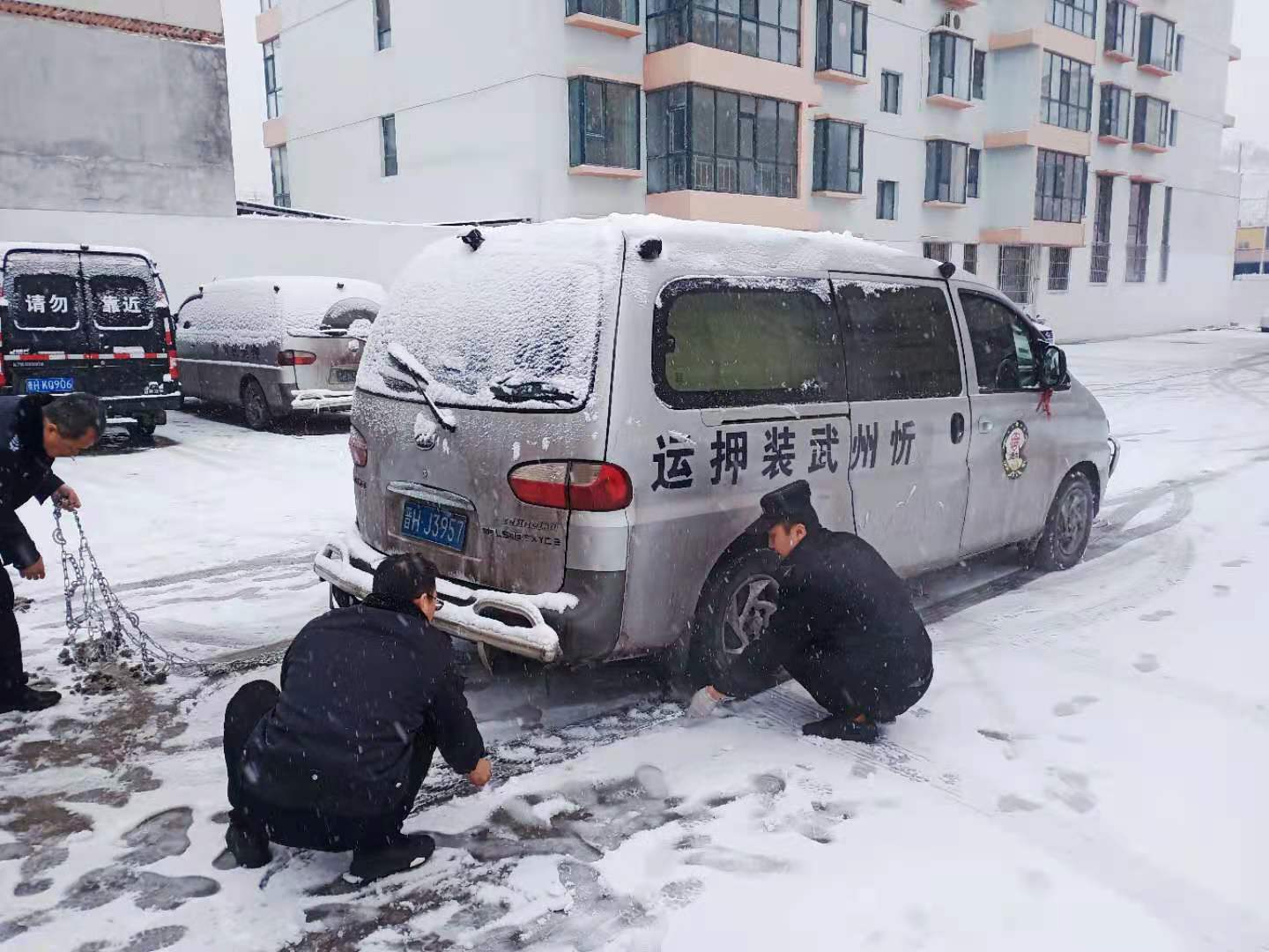 由于降雪天氣給運鈔車安全行駛導致安全隱患,中隊每日關注天氣情況有效應對,及時安排各車組提前做好出車前車輛安全檢查以及安裝防滑鏈,同時囑咐要注意車速,確保行車安全。安全無小事,每一次往返任務都牽動著公司領導的心。由于天氣惡劣,車隊出發(fā)后,中隊管理人員一步不離堅守在崗位上,和各車組隨時保持著聯系,有時隊長、副隊長親自跟車,以便及時了解各車組途中的實際情況。