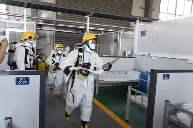 上午10點整,消防演練正式開始,在接到消防中控室的指令后,方艙醫(yī)院1號艙29床發(fā)生火情,全體隊員迅速穿戴整齊消防服和防護(hù)服在預(yù)定時間內(nèi)到達(dá)了演練火災(zāi)現(xiàn)場,執(zhí)行了打開消防栓箱門拉水帶、擰瞄子、開閥門、緊急疏散病人進(jìn)行警戒撲救滅火等演練科目。消防演練結(jié)束后,全體隊員迅速進(jìn)入反恐應(yīng)急演練狀態(tài),根據(jù)演練科目內(nèi)容,其中一名隊員扮演患者情緒失控人員,手持兇器與醫(yī)護(hù)人員發(fā)生爭斗,反恐隊員收到指令后在最短時間內(nèi)攜帶防暴裝備進(jìn)入現(xiàn)場,到達(dá)現(xiàn)場與鬧事人溝通無效后,反恐隊員迅速采取措施將其制服,圓滿完成科目內(nèi)容。