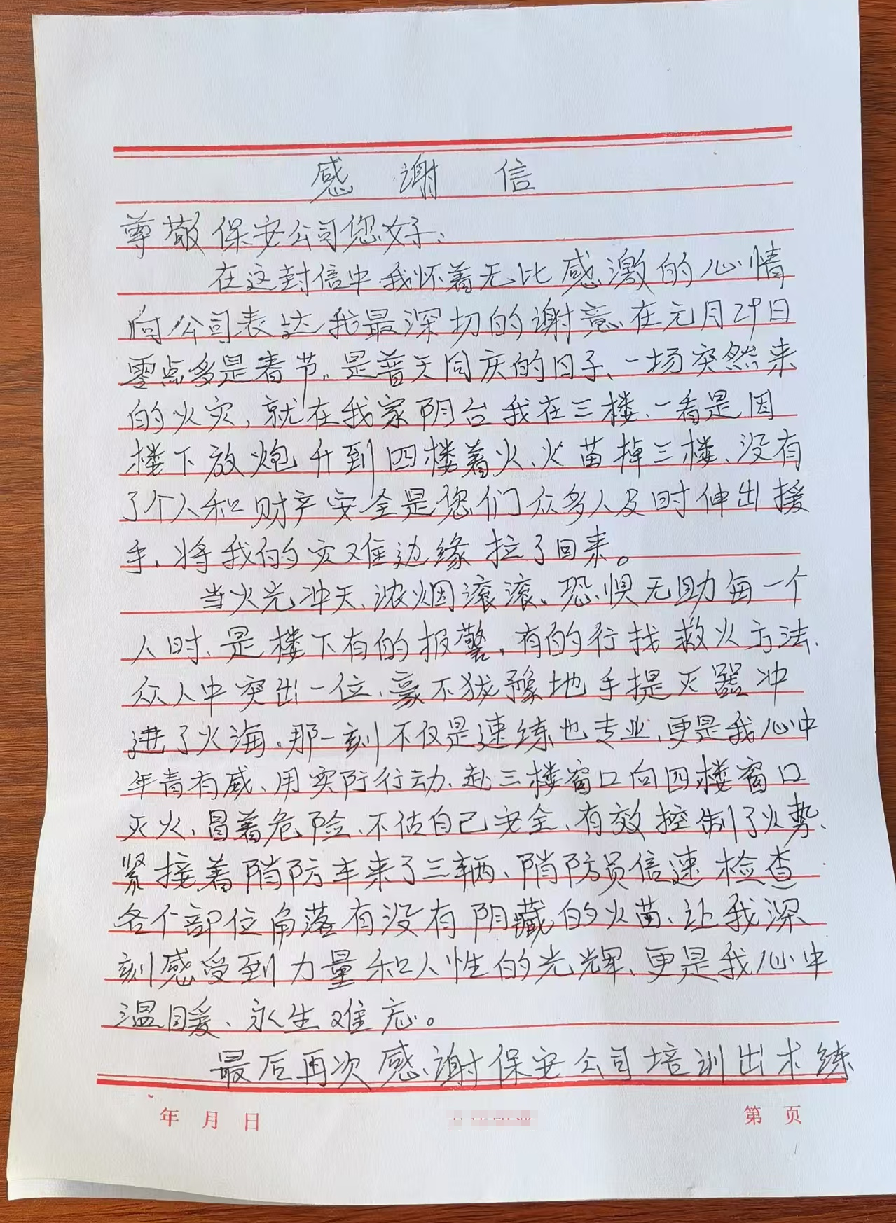 在感謝信中,兩位老人用質(zhì)樸的語(yǔ)言表達(dá)了對(duì)毛國(guó)偉的深深感激,并對(duì)忻州市保安服務(wù)公司表示高度贊揚(yáng)。此次應(yīng)急處置事件不僅展現(xiàn)了毛國(guó)偉個(gè)人的專業(yè)素養(yǎng)和勇敢精神,更是忻州市保安服務(wù)公司注重安全生產(chǎn)、常態(tài)化開(kāi)展消防安全培訓(xùn)和應(yīng)急處突演練的成果體現(xiàn)。