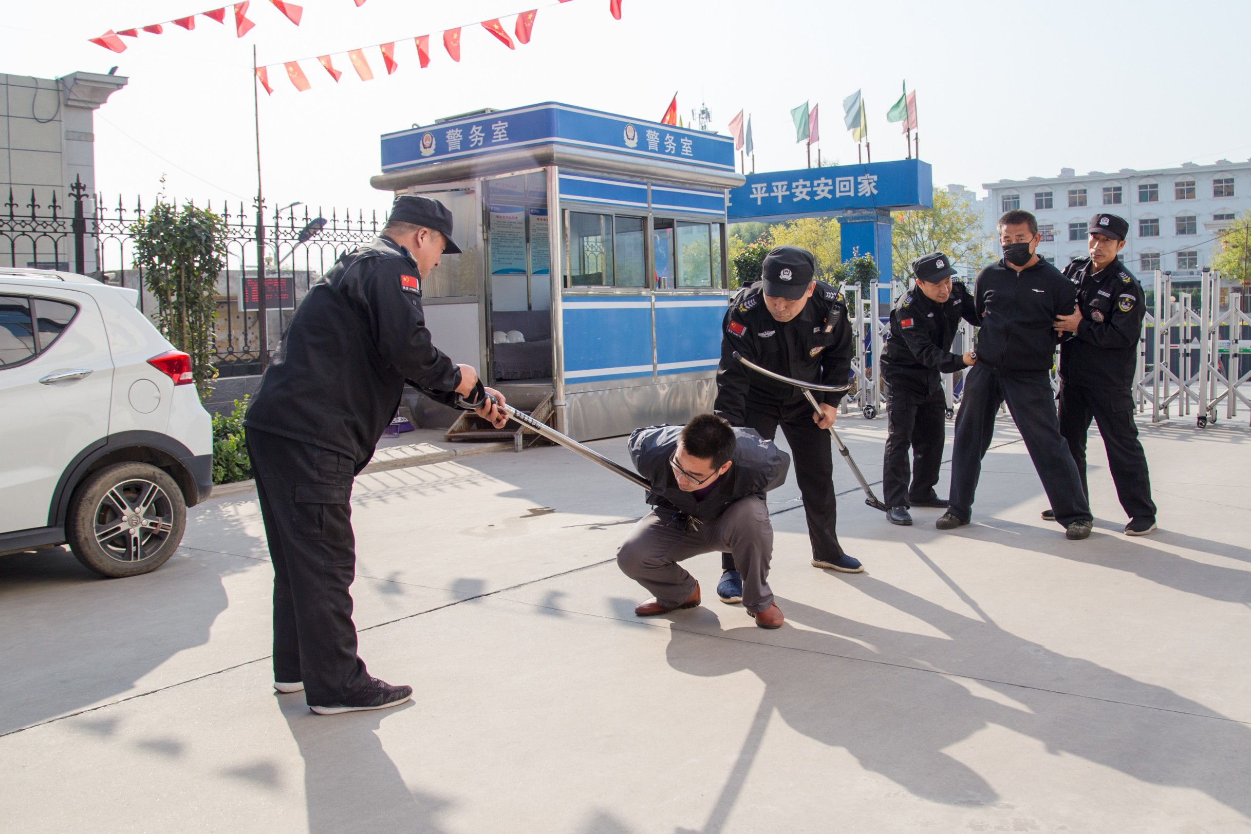 演練開始后,路邊車上下來四名歹徒,手持棍棒沖向大門,門衛(wèi)及時關(guān)閉大門,并用對講機呼叫執(zhí)勤保安,各小組收到信息后,手持防爆工具及時趕赴現(xiàn)場,互相配合,大家齊心協(xié)力把歹徒制服。